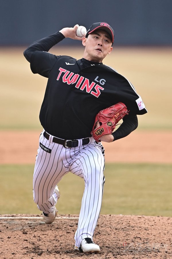 12일 경기도 수원KT위즈파크에서 열린 ‘2022 KBO 리그’ KT 위즈와 LG 트윈스의 시범경기에서 9회말 LG 임정우가 교체로 마운드에 올라 역투하고 있다.
