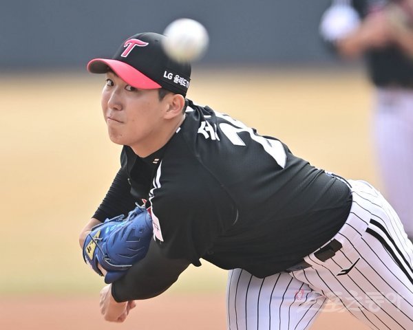 12일 경기도 수원KT위즈파크에서 열린 ‘2022 KBO 리그’ KT 위즈와 LG 트윈스의 시범경기에서 선발 투수로 마운드에 오른 LG 손주영이 역투하고 있다.