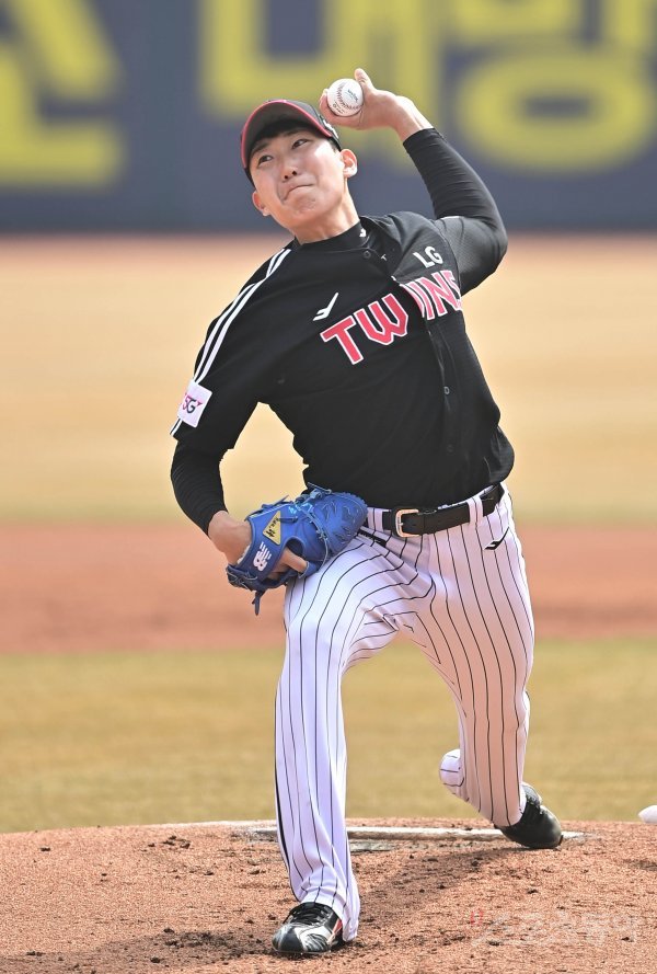 12일 경기도 수원KT위즈파크에서 열린 ‘2022 KBO 리그’ KT 위즈와 LG 트윈스의 시범경기에서 선발 투수로 마운드에 오른 LG 손주영이 역투하고 있다.