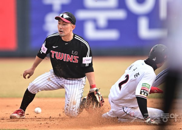 12일 경기도 수원KT위즈파크에서 열린 ‘2022 KBO 리그’ KT 위즈와 LG 트윈스의 시범경기에서 6회말 2사 1루 상황에서 LG 2루수 서건창이 KT 1루주자에게 도루를 허용하고 있다.
