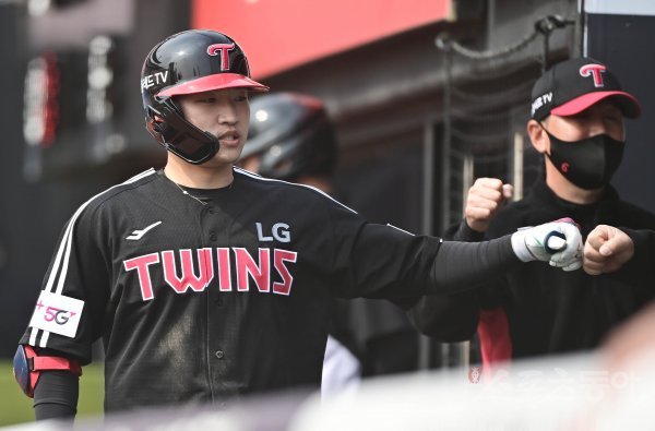 12일 경기도 수원KT위즈파크에서 열린 ‘2022 KBO 리그’ KT 위즈와 LG 트윈스의 시범경기에서 5회초 무사 1, 3루 LG 박해민이 1타점을 올리는 희생플라이를 친 후 더그아웃에서 동료들의 축하를 받고 있다.