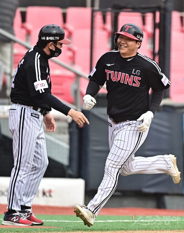 12일 경기도 수원KT위즈파크에서 열린 ‘2022 KBO 리그’ KT 위즈와 LG 트윈스의 시범경기에서 9회초 1사 LG 문보경이 우월 솔로 홈런을 쳐낸 뒤 3루코치와 기쁨을 나누고 있다.