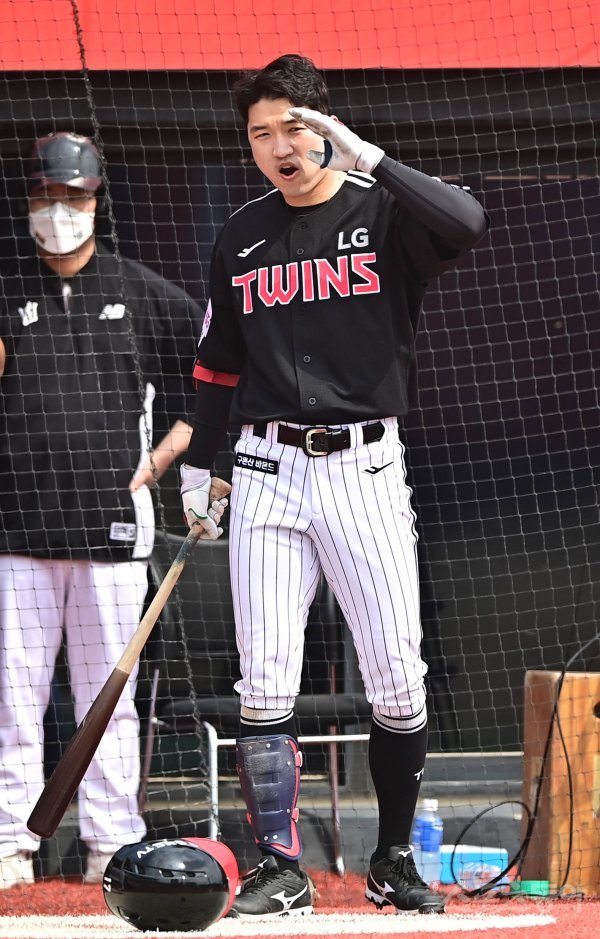 12일 경기도 수원KT위즈파크에서 열린 ‘2022 KBO 리그’ KT 위즈와 LG 트윈스의 시범경기에 앞서 LG 박해민이 KT 선수들을 향해 인사하고 있다.