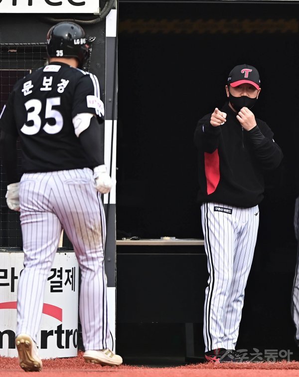 12일 경기도 수원KT위즈파크에서 열린 ‘2022 KBO 리그’ KT 위즈와 LG 트윈스의 시범경기에서 9회초 1사 LG 류지현 감독이 솔로포를 쳐낸 문보경을 축하하고 있다.