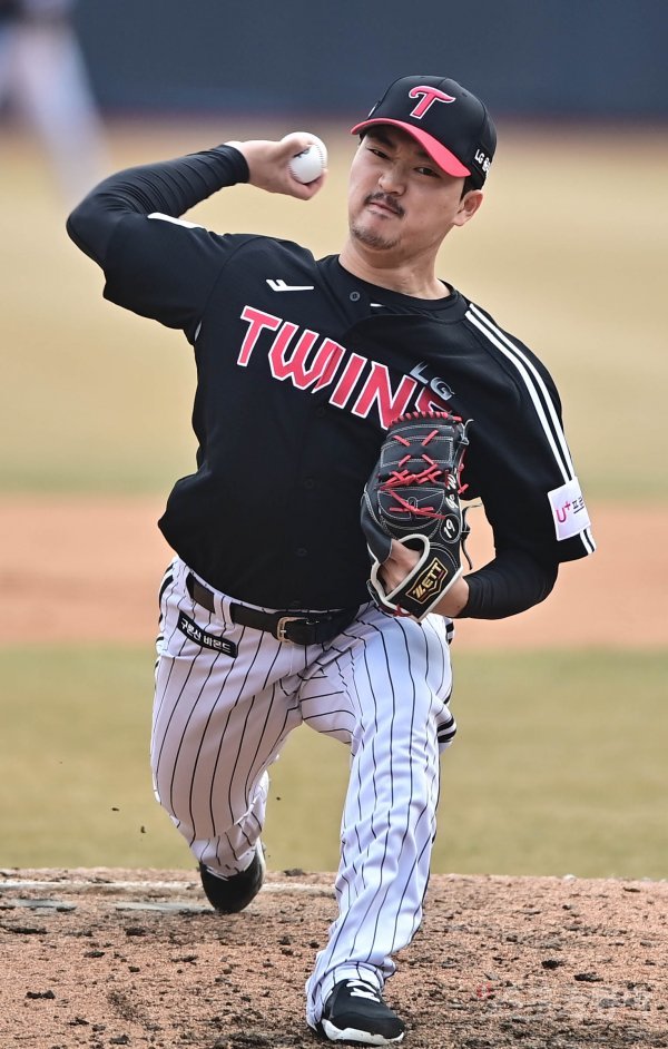 12일 경기도 수원KT위즈파크에서 열린 ‘2022 KBO 리그’ KT 위즈와 LG 트윈스의 시범경기에서 8회말 LG 고우석이 교체로 마운드에 올라 역투하고 있다.