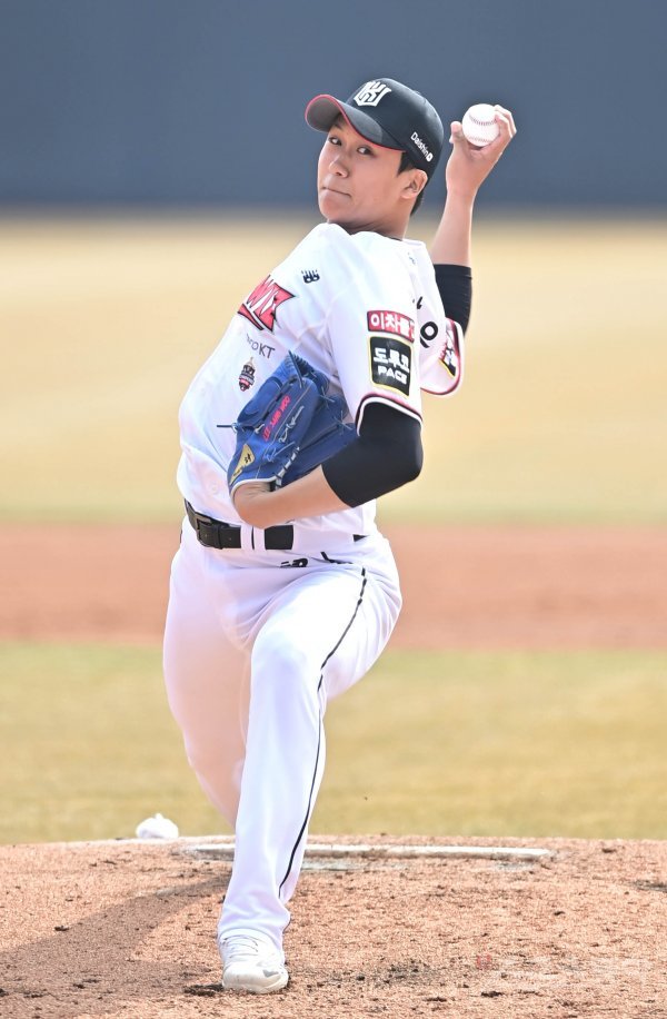 12일 경기도 수원KT위즈파크에서 열린 ‘2022 KBO 리그’ KT 위즈와 LG 트윈스의 시범경기에서 3회초 KT 이상우가 교체로 마운드에 올라 역투하고 있다.