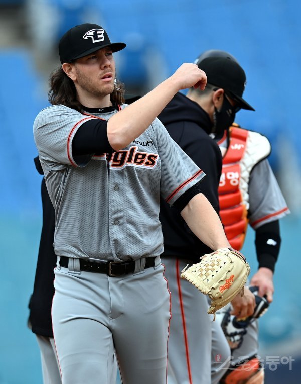 12일 대구 삼성라이온즈파크에서 ‘2022 KBO리그’ 삼성 라이온즈와 한화 이글스의 시범경기가 열렸다. 3회말 2사 3루에서 득점을 허용한 한화 선발 킹험이 교체되고 있다.