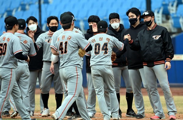 12일 대구 삼성라이온즈파크에서 ‘2022 KBO리그’ 삼성 라이온즈와 한화 이글스의 시범경기가 열렸다. 한화가 상섬을 상대로 9-7로 승리한 뒤 선수들이 그라운드에서 기쁨을 나누고 있다.