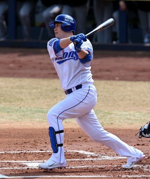 12일 대구 삼성라이온즈파크에서 ‘2022 KBO리그’ 삼성 라이온즈와 한화 이글스의 시범경기가 열렸다. 1회말 2사 1, 3루에서 삼성 이원석이 1타점 적시타를 날리고 있다.