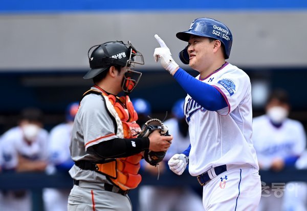 12일 대구 삼성라이온즈파크에서 ‘2022 KBO리그’ 삼성 라이온즈와 한화 이글스의 시범경기가 열렸다. 3회말 1사 1루에서 삼성 오재일이 투런 홈런을 쏘아 올린 후 세리머니를 펼치고 있다.