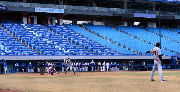 12일 대구 삼성라이온즈파크에서 ‘2022 KBO리그’ 삼성 라이온즈와 한화 이글스의 시범경기가 열렸다. 코로나19 여파로 무관중으로 시범경기가 펼쳐지고 있다.