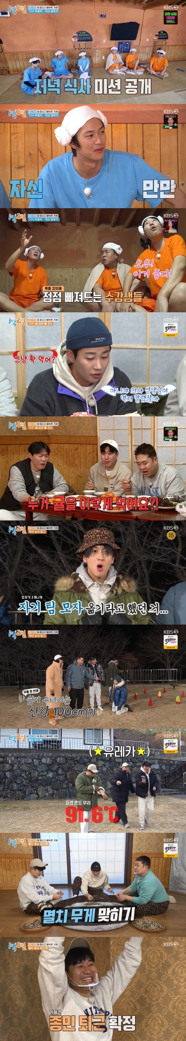 다음날 기상 미션으로는 등의 피부 온도를 올려야 하는 ‘등 따시게’ 게임이 시작됐다. ‘우라딘’ 팀은 곧장 찜질방으로 향했지만, 밖에 남은 ‘정종윤 씨’ 팀은 등을 때리고 비틀면서(?) 마찰을 일으키는 것을 선택했다. 제한시간이 끝난 뒤 나인우의 피부 온도는 약 12도 상승한 반면, 김종민은 겨우 3도만 상승한 탓에 패배하게 됐다. “이러려고 나 때린 거야?”라면서 배신감에 휩싸인 김종민에게 연정훈은 “온도가 올라가긴 했네”라면서 뻔뻔하게 대응해 시청자들의 배꼽을 쥐게 했다.