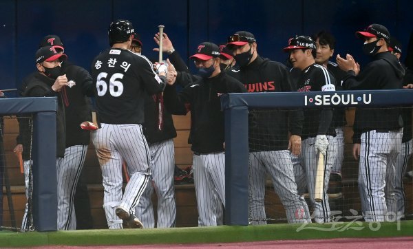 14일 서울 고척스카이돔에서 ‘2022 신한은행 MY CAR KBO리그’ LG트윈스와 키움 히어로즈의 시범경기가 열렸다. 8회초 무사 LG 송찬의가 좌월 솔로 홈런을 날린 후 그라운드를 돌아 홈인해 류지현 감독의 축하를 받고 있다.
