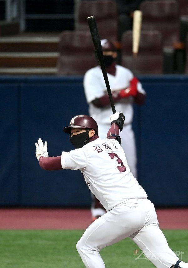 14일 서울 고척스카이돔에서 ‘2022 신한은행 MY CAR KBO리그’ LG트윈스와 키움 히어로즈의 시범경기가 열렸다. 2회말 1사 키움 김혜성이 좌전 안타를 치고 있다.
