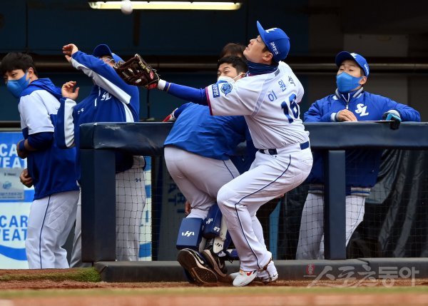 14일 대구 삼성라이온즈파크에서 ‘2022 KBO리그’ 삼성 라이온즈와 KIA 타이거즈의 시범경기가 열렸다. 3회초 2사 1, 2루에서 삼성 이원석이 파울타구를 잡아내고 있다.