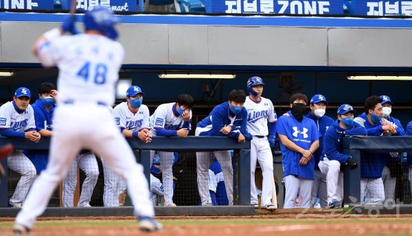 14일 대구 삼성라이온즈파크에서 ‘2022 KBO리그’ 삼성 라이온즈와 KIA 타이거즈의 시범경기가 열렸다. 9회말 삼성의 마지막 공격 때 선수들이 더그아웃에서 경기를 지켜보고 있다.