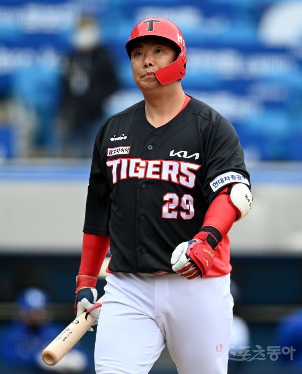 14일 대구 삼성라이온즈파크에서 ‘2022 KBO리그’ 삼성 라이온즈와 KIA 타이거즈의 시범경기가 열렸다. 4회초 1사에서 KIA 나지완이 삼진 아웃으로 물러나고 있다.