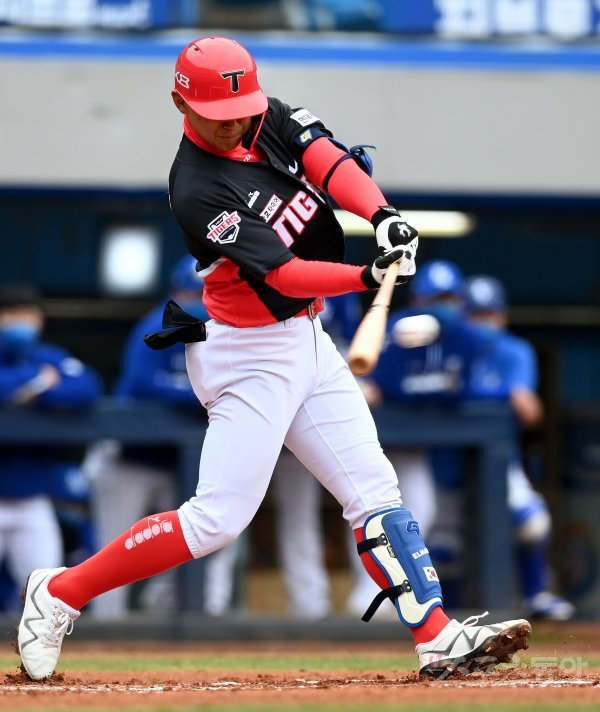 14일 대구 삼성라이온즈파크에서 ‘2022 KBO리그’ 삼성 라이온즈와 KIA 타이거즈의 시범경기가 열렸다. 3회초 2사 1루에서 KIA 김도영이 안타를 날리고 있다.