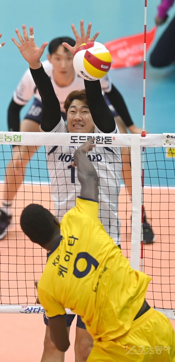 14일 의정부체육관에서 열린 ‘2021~2022 도드람 V-리그’ 남자부 2위 KB손해보험과 3위 우리카드 경기에서 우리카드 나경복이 블로킹을 시도하고 있다.
