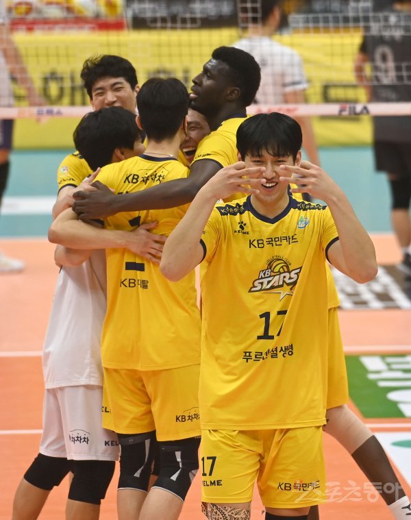 14일 의정부체육관에서 열린 ‘2021~2022 도드람 V-리그’ 남자부 2위 KB손해보험과 3위 우리카드 경기에서 KB손해보험 한성정이 서브 득점에 성공한 후 기뻐하고 있다.