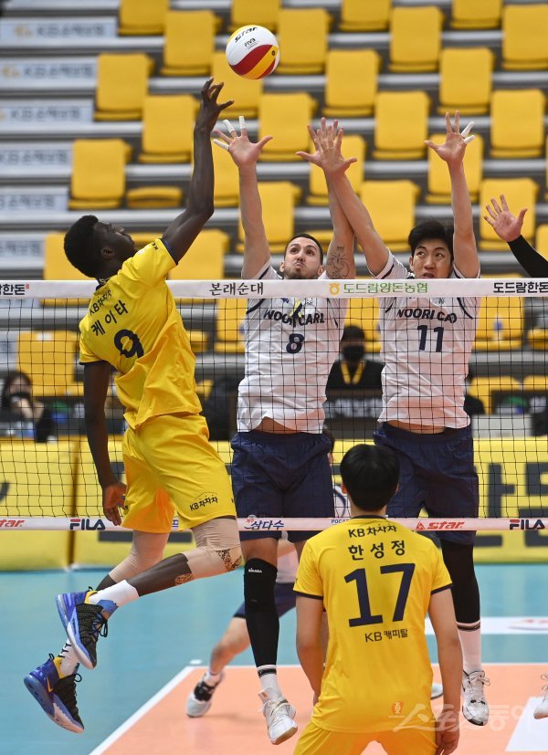 14일 의정부체육관에서 열린 ‘2021~2022 도드람 V-리그’ 남자부 2위 KB손해보험과 3위 우리카드 경기에서 우리카드 알렉스와 김재휘가 블로킹을 시도하고 있다.
