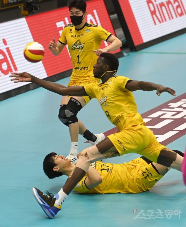14일 의정부체육관에서 열린 ‘2021~2022 도드람 V-리그’ 남자부 2위 KB손해보험과 3위 우리카드 경기에서 KB손배보험이 세트스코어 3-2 승리를 거뒀다. KB손배보험 케이타가 디그에 성공하고 있다.