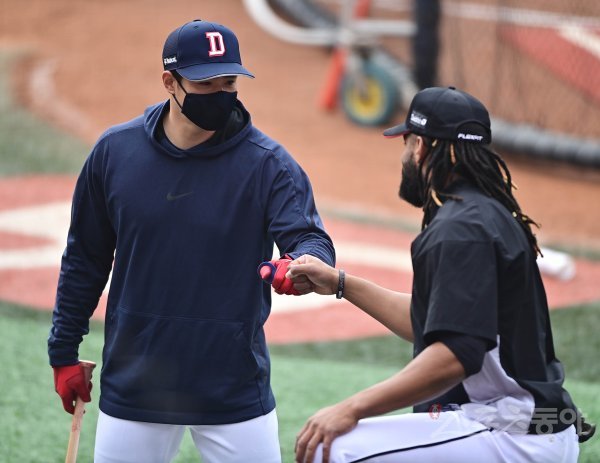 15일 경기도 수원KT위즈파크에서 열린 ‘2022 KBO 리그’ KT 위즈와 두산 베어스의 시범경기에 앞서 두산 김재환이 KT 선수들과 인사하고 있다.