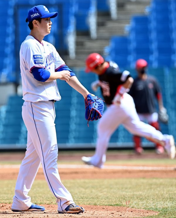 15일 대구 삼성라이온즈파크에서 ‘2022 KBO리그’ 삼성 라이온즈와 KIA 타이거즈의 시범경기가 열렸다. 3회초 1사 1, 2루에서 KIA 최형우에게 3점 홈런을 허용한 삼성 최하늘이 아쉬워하고 있다.