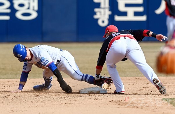 15일 대구 삼성라이온즈파크에서 ‘2022 KBO리그’ 삼성 라이온즈와 KIA 타이거즈의 시범경기가 열렸다. 7회말 무사 1루에서 삼성 김성윤이 2루 도루를 성공시키고 있다.