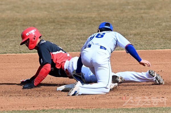 15일 대구 삼성라이온즈파크에서 ‘2022 KBO리그’ 삼성 라이온즈와 KIA 타이거즈의 시범경기가 열렸다. 4회초 2사 1루에서 KIA 김도영이 2루 도루를 시도했으나 삼성 김지찬에게 태그 아웃되고 있다.