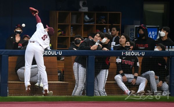 15일 서울 고척스카이돔에서 ‘2022 신한은행 MY CAR KBO리그’ LG 트윈스와 키움 히어로즈의 시범경기가 열렸다. 5회초 1사 3루 상황에서 키움 김주형이 파울볼을 잡기 위해 LG 더그아웃까지 달려 갔으나 놓치고 있다.