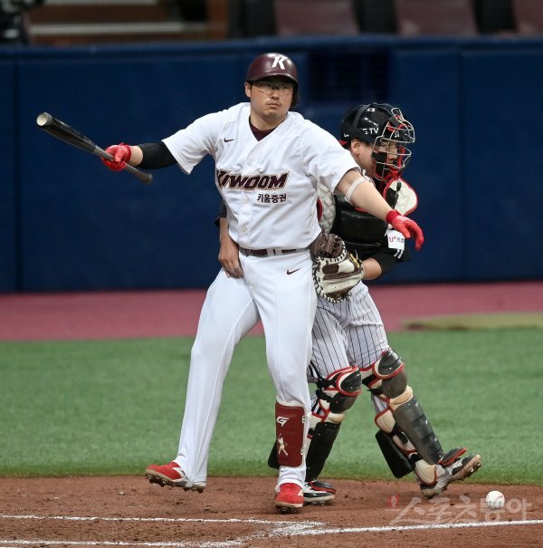 15일 서울 고척스카이돔에서 ‘2022 신한은행 MY CAR KBO리그’ LG 트윈스와 키움 히어로즈의 시범경기가 열렸다. 4회말 LG 포수 허도환이 파울볼을 잡으며 티움 이지영의 유니폼도 잡고 있다.