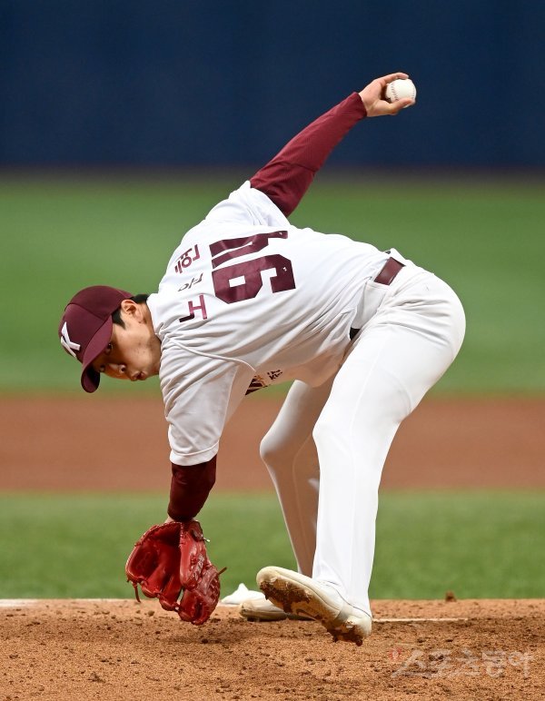 15일 서울 고척스카이돔에서 ‘2022 신한은행 MY CAR KBO리그’ LG 트윈스와 키움 히어로즈의 시범경기가 열렸다. 교체 등판한 키움 노운현이 역투하고 있다.