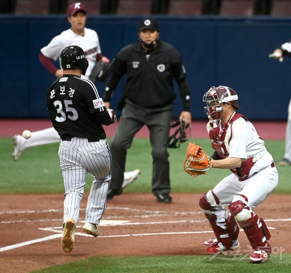 15일 서울 고척스카이돔에서 ‘2022 신한은행 MY CAR KBO리그’ LG 트윈스와 키움 히어로즈의 시범경기가 열렸다. 3회초 1사 2루 LG 적시타 때 2루주자 문보경이 홈까지 달려 세이프 되고 있다.