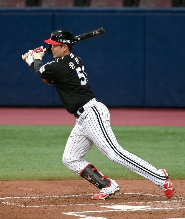 15일 서울 고척스카이돔에서 ‘2022 신한은행 MY CAR KBO리그’ LG 트윈스와 키움 히어로즈의 시범경기가 열렸다. 3회초 1사 2루 LG 홍창기가 1타점 적시타를 치고 있다.