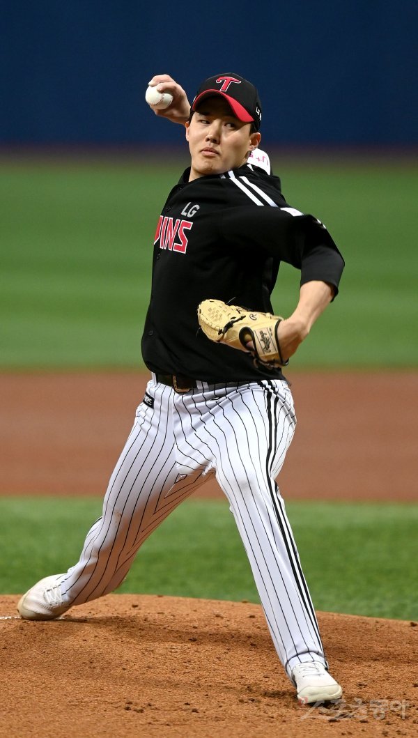 15일 서울 고척스카이돔에서 ‘2022 신한은행 MY CAR KBO리그’ LG 트윈스와 키움 히어로즈의 시범경기가 열렸다. 선발 투수로 등판한 LG 임찬규가 역투하고 있다.