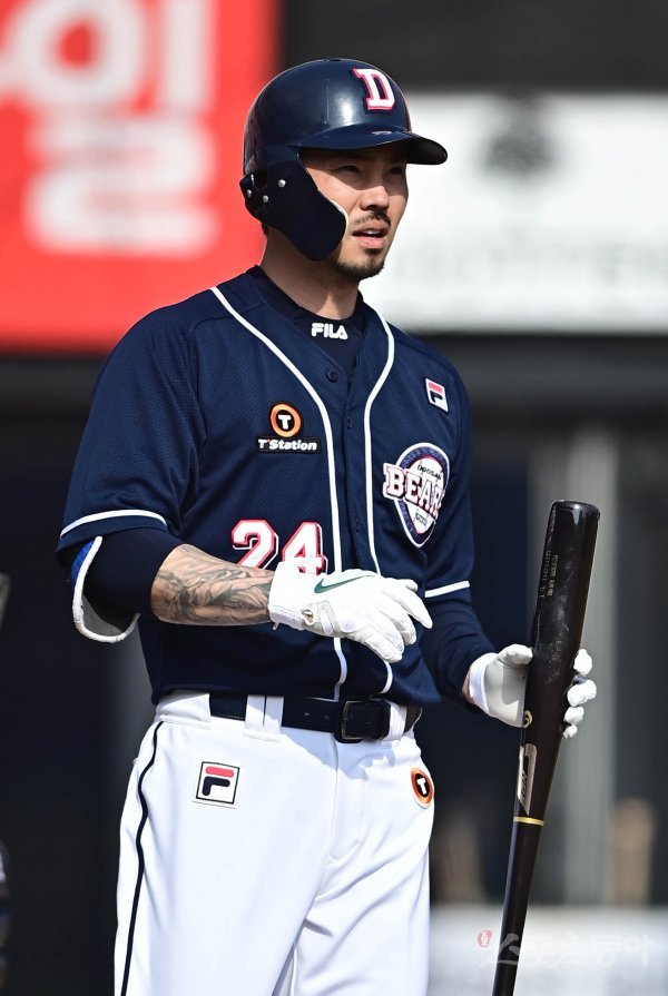 15일 경기도 수원KT위즈파크에서 열린 ‘2022 KBO 리그’ KT 위즈와 두산 베어스의 시범경기에서 7회초 1사 1, 2루 두산 오재원이 헛스윙에 아쉬워하고 있다.