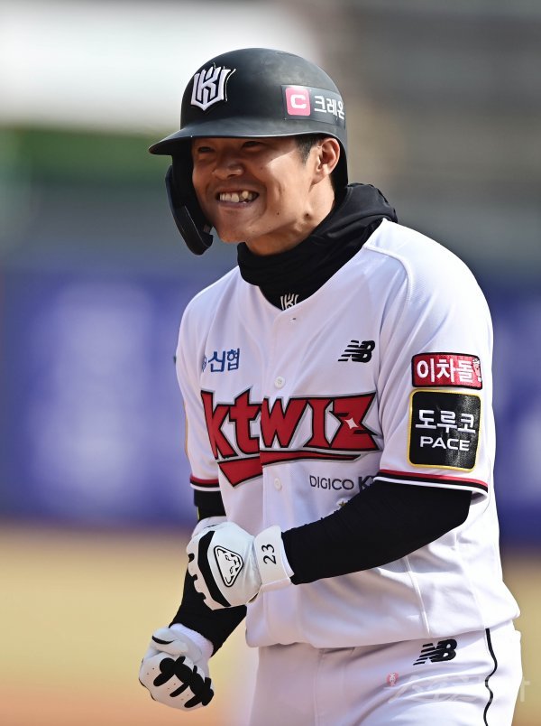 15일 경기도 수원KT위즈파크에서 열린 ‘2022 KBO 리그’ KT 위즈와 두산 베어스의 시범경기에서 3회초 1사 1, 3루 KT 조용호가 1타점 우전 적시타를 쳐낸 뒤 세리머니를 하고 있다.