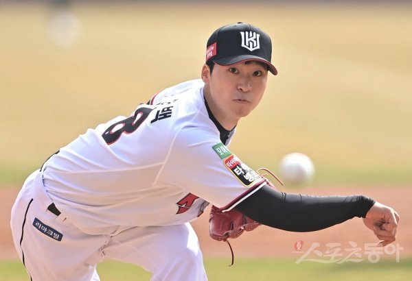 15일 경기도 수원KT위즈파크에서 열린 ‘2022 KBO 리그’ KT 위즈와 두산 베어스의 시범경기에서 3회초 KT 엄상백이 교체로 마운드에 올라 역투하고 있다.
