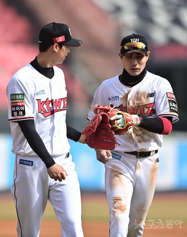 15일 경기도 수원KT위즈파크에서 열린 ‘2022 KBO 리그’ KT 위즈와 두산 베어스의 시범경기에서 4회초 수비를 마친 KT 엄상백과 심우준이 글러브를 맞대고 있다.