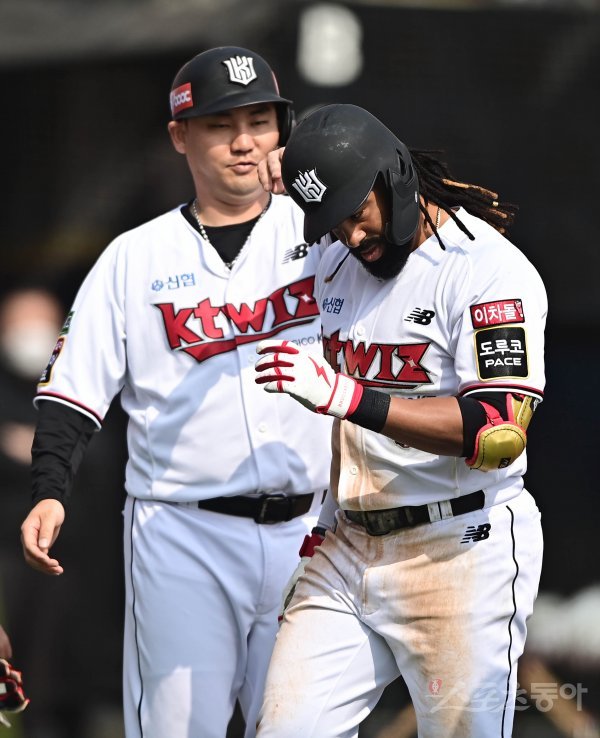 15일 경기도 수원KT위즈파크에서 열린 ‘2022 KBO 리그’ KT 위즈와 두산 베어스의 시범경기에서 3회말 1사 만루 KT 라모스가 좌월 만루 홈런을 쳐낸 뒤 장성우의 축하를 받고 있다.