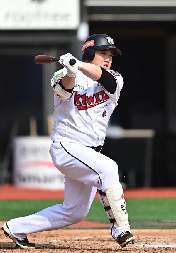 15일 경기도 수원KT위즈파크에서 열린 ‘2022 KBO 리그’ KT 위즈와 두산 베어스의 시범경기에서 4회말 무사 KT 김준태가 우월 솔로 홈런을 치고 있다.