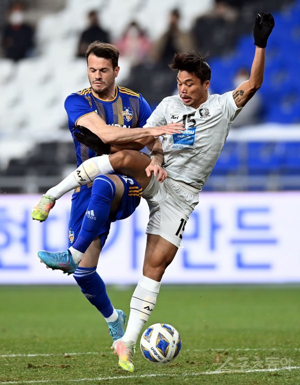 15일 울산 문수축구경기장에서 열린 ‘2022 아시아챔피언스리그(ACL)’ 울산 현대와 포트 FC의 PO경기에서 울산 바코가 상대 선수의 반칙을 얻어내고 있다.