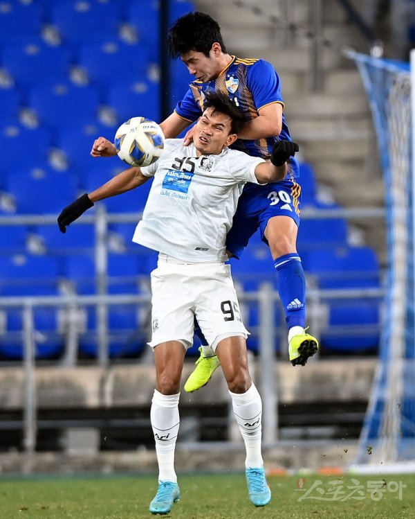 15일 울산 문수축구경기장에서 열린 ‘2022 AFC 챔피언스리그(ACL)’ 울산 현대와 포트 FC의 PO경기에서 울산 김재성이 상대 선수와 공중볼을 다투고 있다.