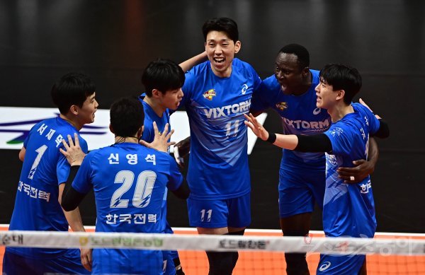 15일 경기도 안산상록수체육관에서 열린 ‘2021~2022 도드람 V-리그’ 남자부 안산 OK금융그룹과 수원 한국전력의 경기에서 한국전력 선수들이 득점에 성공한 후 기쁨을 나누고 있다.