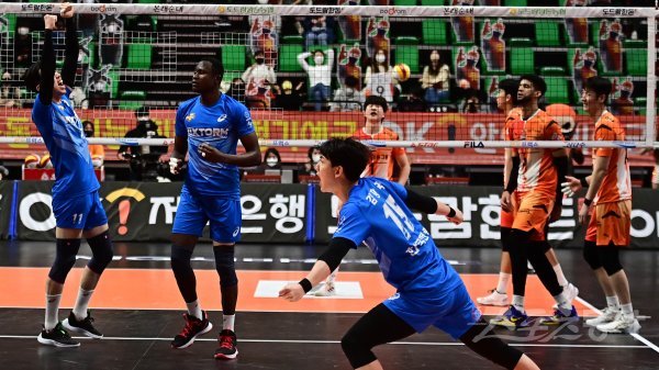 15일 경기도 안산상록수체육관에서 열린 ‘2021~2022 도드람 V-리그’ 남자부 안산 OK금융그룹과 수원 한국전력의 경기에서 OK금융그룹에 세트스코어 3-1로 승리를 거둔 한국전력 선수들이 기뻐하고 있다.