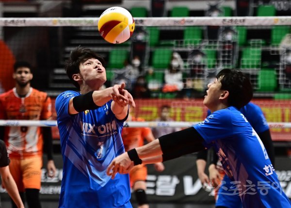 15일 경기도 안산상록수체육관에서 열린 ‘2021~2022 도드람 V-리그’ 남자부 안산 OK금융그룹과 수원 한국전력의 경기에서 한국전력 이시몬이 리시브를 하고 있다.