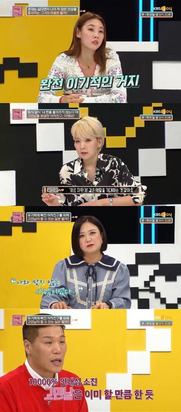 이에 서장훈은 "나이 많은 남자의 메리트가 무엇이겠나. 자신이 어떤 행동을 해도 이해해주길 바라는 거다"라고 분석했고, 곽정은은 "기대하는 건 본인 자유지만 부모도 주지 못하는 포용적인 사랑을 11세 많은 사람에게 기대하고 있다. 고민남에게 '위로 자판기' 같은 역할을 기대한다"라고 지적했다.