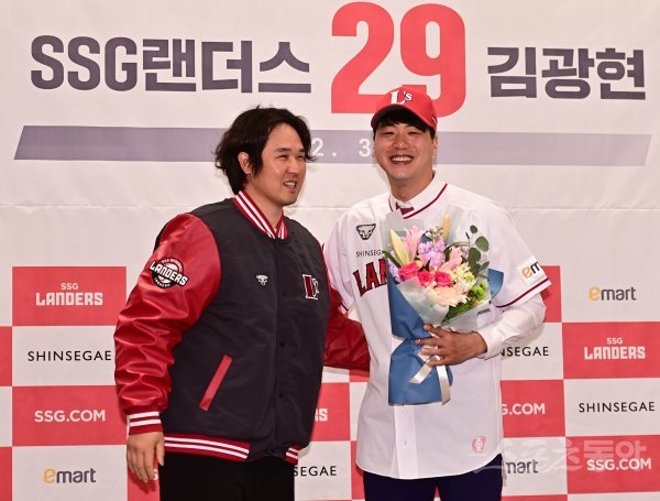 SSG 김광현이 16일 인천 연수구 오라카이 송도파크호텔에서 열린 SSG 랜더스 입단식 및 기자회견에서 최정으로부터 꽃다발을 받고 있다.