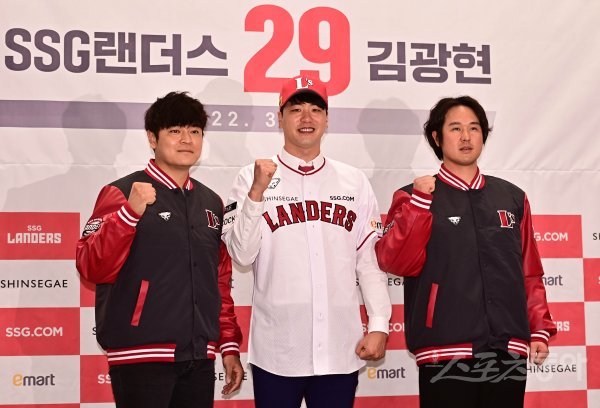 SSG 김광현이 16일 인천 연수구 오라카이 송도파크호텔에서 열린 SSG 랜더스 입단식 및 기자회견에서 추신수, 최정과 기념 촬영을 하고 있다.